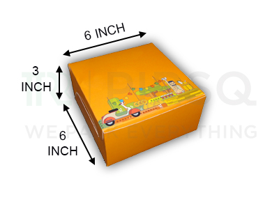 The multicolor printed paper boxes 6 inches X 6 inches X 3 inches are manufactured from good quality 300GSM recycled paperboard. Your brand design will be printed all over the box. The disposable paper box isn't food-grade from the inside. It means you'll be using food-grade pouches, and butter paper to wrap your items before packing them inside the paper box. We can laminate the box from the inside for marginal cost difference.